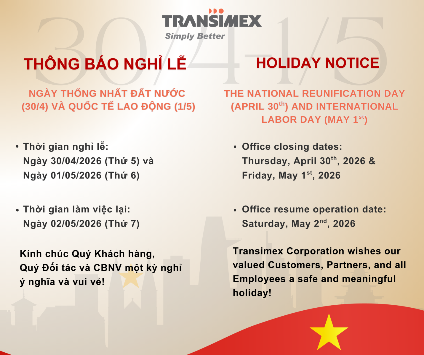 Transimex Corporation respectfully informs that our offices will be closed on the National Reunification Day (April 30th, 2026) and International Labor Day (May 1st, 2026) holidays as follows: