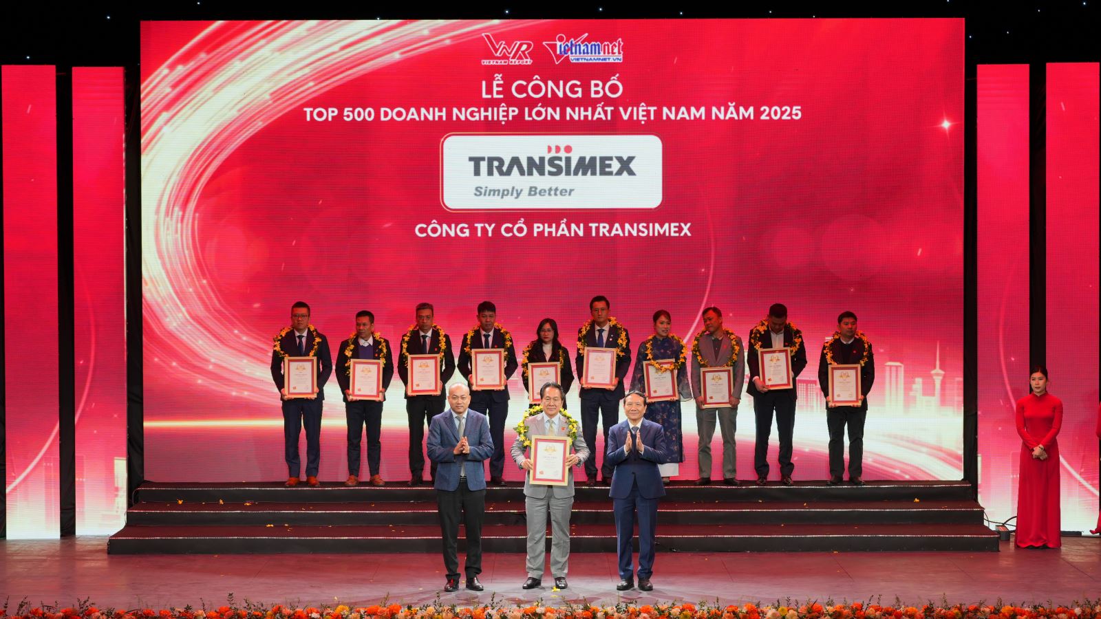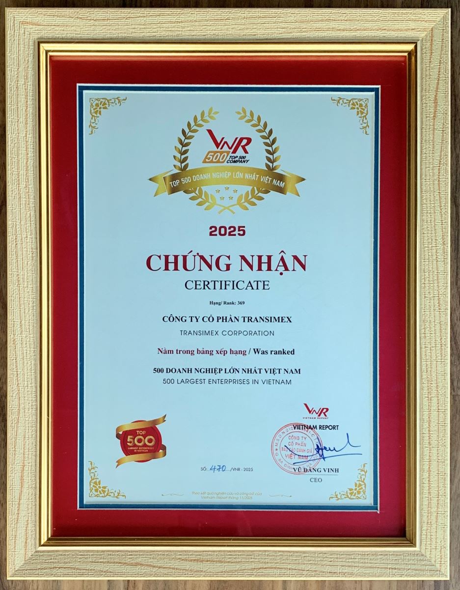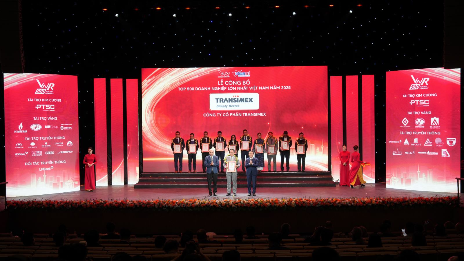 Tại sự kiện, Công ty Cổ phần Transimex đã vinh dự góp mặt trong Bảng xếp hạng TOP 500 Doanh nghiệp lớn nhất Việt Nam năm 2025. Đây là sự ghi nhận xứng đáng cho những nỗ lực không ngừng nghỉ, hiệu quả hoạt động, chiến lược phát triển bền vững, tập trung vào ngành nghề kinh doanh cốt lõi và uy tín thương hiệu mà Transimex đã không ngừng xây dựng trong suốt hơn 42 năm hình thành và phát triển.